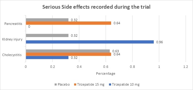 Two deaths happened in the Tirzepatide 10 mg group, and 68 individuals (7%) experienced serious adverse events overall. However, the investigator did not believe that the deaths were connected to the research medication.