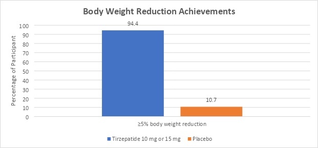 Surmount 3's clinical trial results are very comparable to their predecessors. During the 12-week lead-in period of lifestyle modifications, 579 (71.8%) participants lost ≥5% of their weight. They were qualified for the next step, which is the treatment of tirzepatide (10 mg or 15 mg) or placebo for the next 72 weeks. At the start of the study, the mean body weight was 241.4 lb. (109.5 kg). At the end of the 12-week lead-in period, participants achieved 6.9% (7.6 kg or 16.8 lb.) mean weight loss. In a co-primary endpoint, tirzepatide-taking participants lost an extra 21.1% mean weight after the lead-in period.