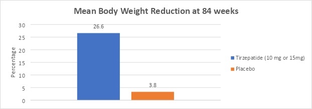 Participants reached a total mean weight loss of 26.6% (29.2 kg or 64.4 lb) over 84 weeks of study enrollment, according to a secondary endpoint. Over 84 weeks, the placebo group's participants lost a total of 3.8% (4.1 kg or 9.0 lb) in weight.
