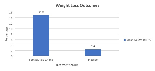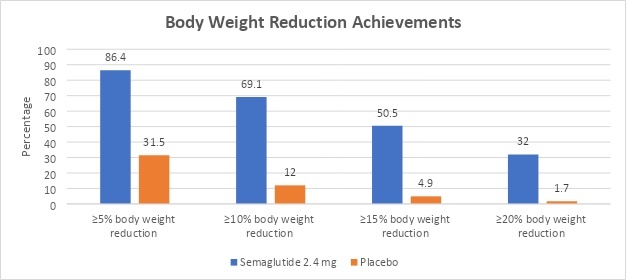 The STEP-1 clinical trial’s participants had a mean age of 46 years and were obese (BMI ≥ 30 kg/m2) or overweight (BMI ≥ 27 kg/m2) with at least one weight-related complication (hypertension, dyslipidemia, obstructive sleep apnea, or cardiovascular disease), excluding type 2 diabetes. In 1961, participants were enrolled in the trial and tested at 129 sites in over 16 countries. The clinical trial was conducted over 68 weeks with 2.4 mg of subcutaneous semaglutide (Wegovy) or placebo once a week plus lifestyle intervention. The semaglutide dosage will increase as follows: 0.25 mg in weeks 1 through 4, 0.5 mg in weeks 5 through 8, 1.0 mg in weeks 9 through 12, 1.7 mg in weeks 13 through 16, and 2.4 mg in weeks 17 through 68.