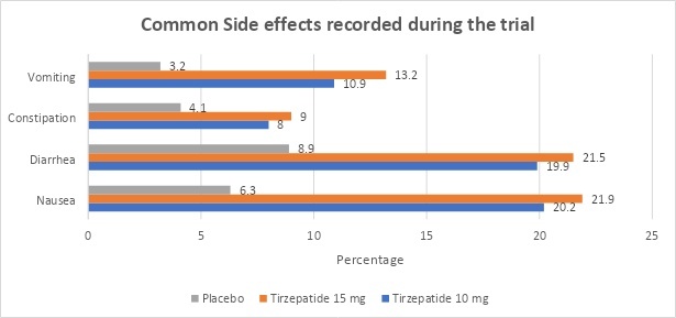 Two deaths happened in the Tirzepatide 10 mg group, and 68 individuals (7%) experienced serious adverse events overall. However, the investigator did not believe that the deaths were connected to the research medication.